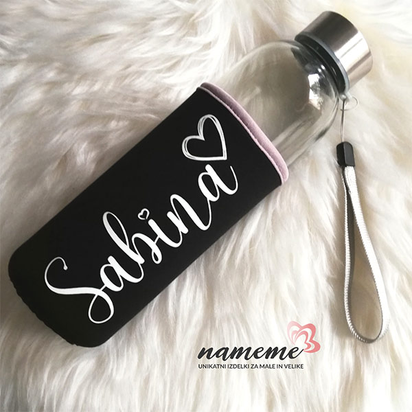 Steklenica za vodo z imenom je narejena iz kakovostnega in lahkega borosilikatnega stekla, zaščitena pa je s prikupnim neoprenom v roza, črni ali beli barvi.
